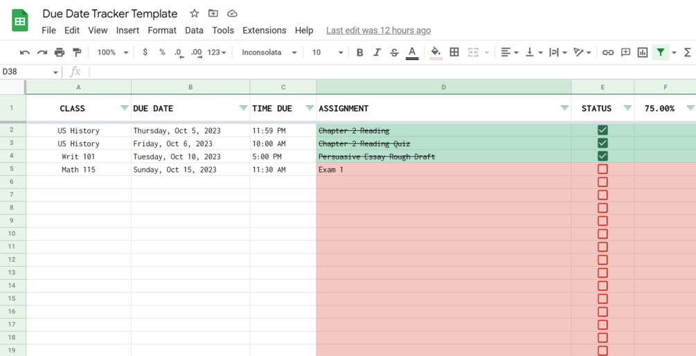 This Google Sheets Template is pre-coded, designed specifically to help track and manage due dates/deadlines. It is a great tool for schoolwork such as: homework, projects, exams, etc. With many features to track completion progress, this template is ideal for those looking for an organized place to keep track of all assignments, limiting the possibility of missing deadlines. The best part: once purchased, this template is reusable!
